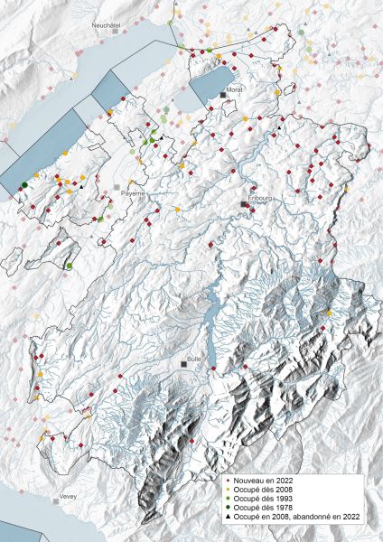 Entre 2008 et 2022, on a observé une densification des territoires dans la partie septentrionale, le long de la Broye et de la Sarine, sur les lacs de Neuchâtel et de Morat ainsi que sur leurs affluents. L’effectif de castors a ainsi quadruplé dans le canton de Fribourg et l’on y compte aujourd’hui 401 castors, répartis sur 125 territoires[3].